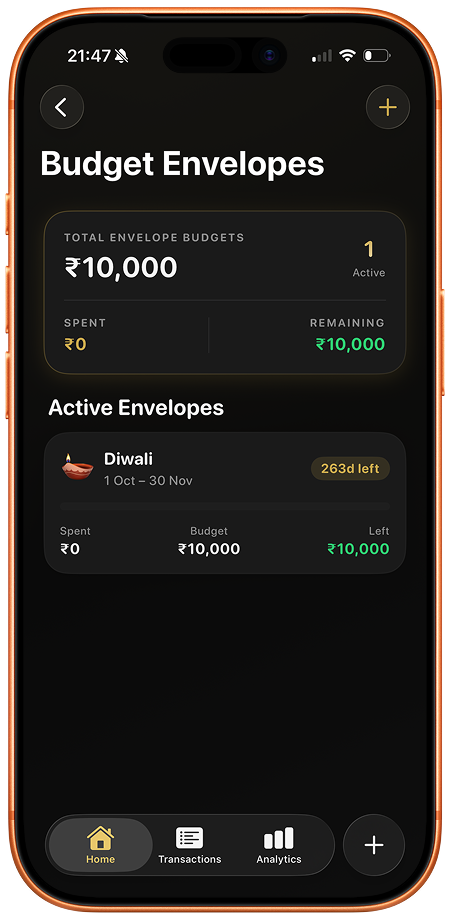 Allocate money to envelopes (Groceries, Eating Out, Travel) and track how much is left. A simple way to stick to your budget.