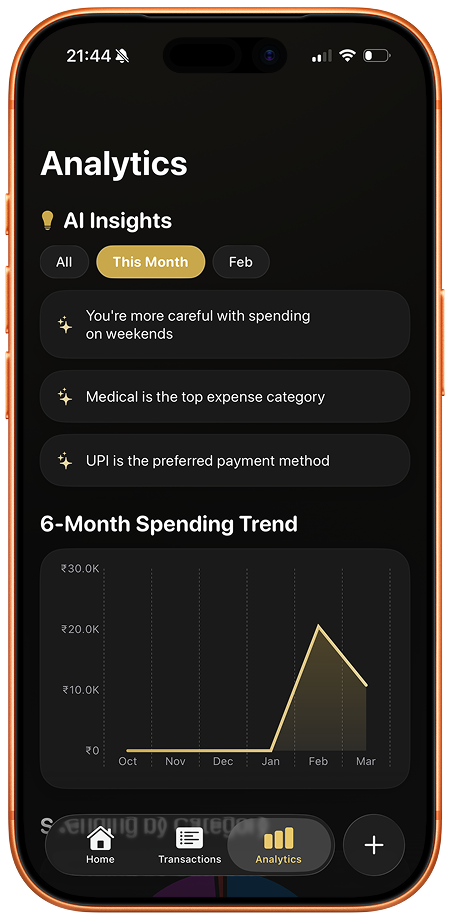 See your spending by category, payment method, and month. Find your biggest expenses and get AI-powered insights about your habits.